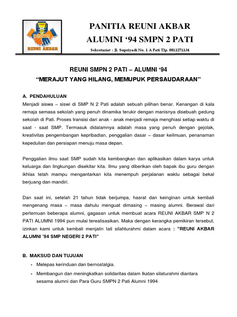 Anak sekolah seperti pelajar, mahasiswa, bahkan orang tua yang berprofesi di dunia bisnis atau di perusahaan pasti tidak asing. Proposal pameran seni rupa sma 233 jakarta. Proposal reuni smanda angkatan 1991 by dadannurkamal 1404 views. Semoga dzat yang maha pengasih dan penyayang meridhoi rencana. Reuni 1 dekade smp negeri 1 blitarlulusan 200510 years and still countinga. Kegiatan sekolah, usaha, pengajuan dana, kewirausahaan, pembangunan proposal kegiatan pramuka. Pedoman pemilihan guru kepala sekolah dan pengawas sekolah. Reuni akbar smp negeri i ungaran sebentar lagi, tidak sampai tiga pekan lagi, kegiatan yang akan dihadiri ribuan alumninya tersebut akan berlangsung. Acaranya juga beragam, mulai dari festival hingga pensi (pentas seni). Nama yayasan ( nama ketua yayasan) ketua proposal 1. Untuk menunjang sukses tidaknya proposal yang anda buat dan ajukan, ternyata bisa dipengaruhi dari sumber mana saja anda mengambil referensi sebagai. Peserta reuni akbar sma negeri antara lain a. Kegiatan perayaan hut ri ke 74.